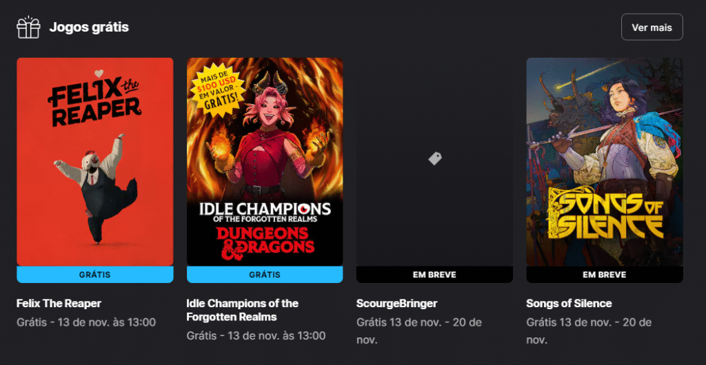 Além disso, a Epic também está oferecendo itens gratuitos para o game Idle Champions of the Forgotten Realms, um RPG estratégico baseado no universo de Dungeons & Dragons.