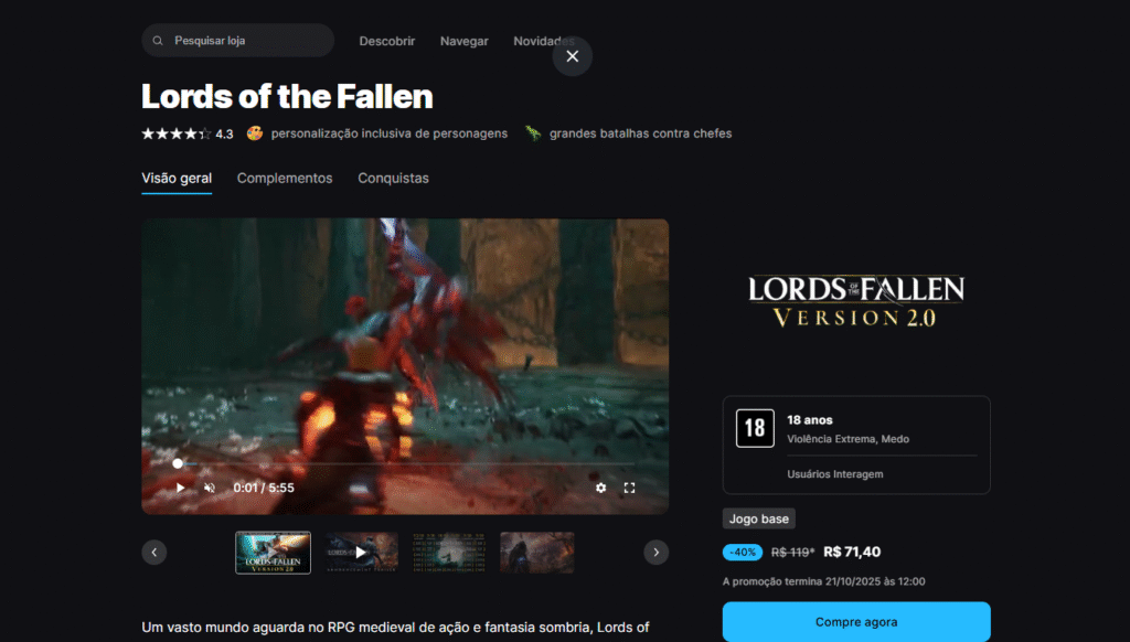 Os fãs de RPGs desafiadores e combates brutais têm motivos de sobra para comemorar. Lords of the Fallen (2023), um dos principais títulos soulslike dos últimos anos, está com 40% de desconto na Epic Games Store, podendo ser adquirido por R$ 71,40 por tempo limitado.