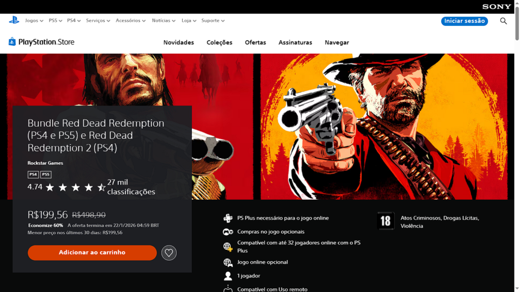 Se você quer a experiência completa do Velho Oeste, o bundle com Red Dead Redemption 1 e 2 também está disponível na PlayStation Store com 60% de desconto, saindo por apenas R$ 199,56.