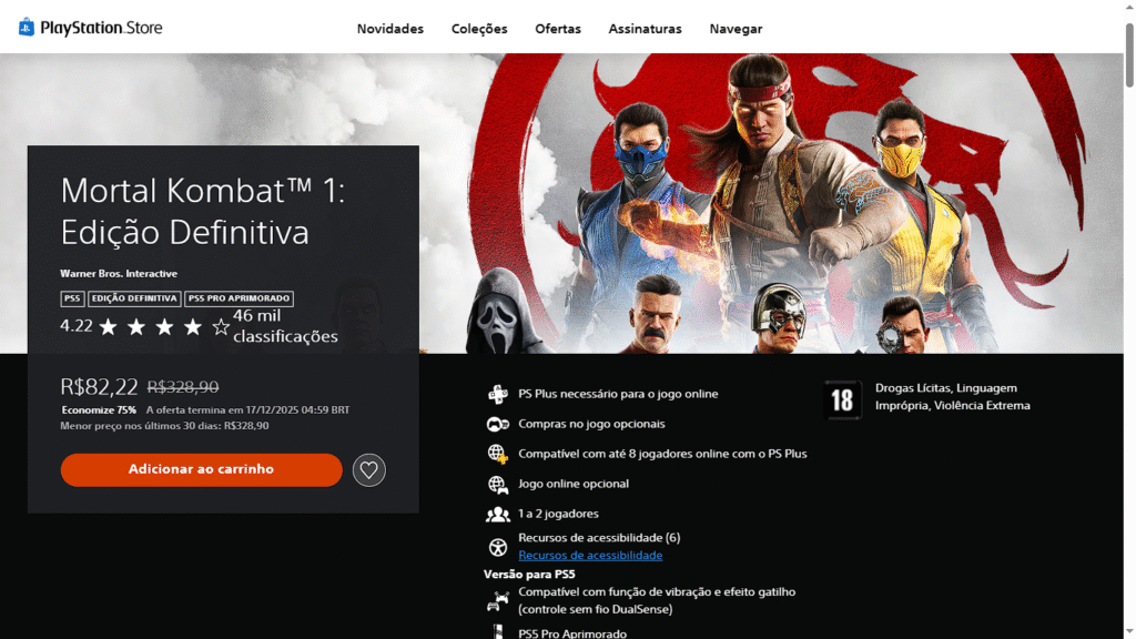 Atenção, kombatentes! A PlayStation Store acaba de lançar uma nova rodada de promoções e um dos grandes destaques é Mortal Kombat 1 – Edição Definitiva, que está com 75% de desconto, podendo ser adquirido por apenas R$ 82,22.