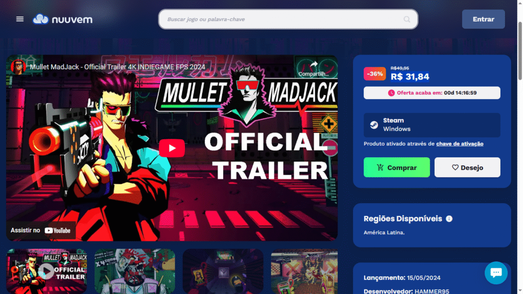 Prepare-se para um show de explosões, velocidade e pura insanidade: Mullet Madjack está em promoção na Nuuvem com 36% de desconto, custando apenas R$ 31,84.