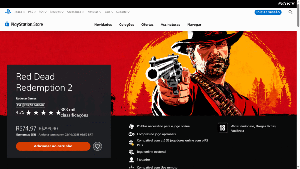 Basta acessar a loja pelo console ou pelo aplicativo PS App, buscar por Red Dead Redemption 2 e garantir sua cópia digital por apenas R$ 74,97.