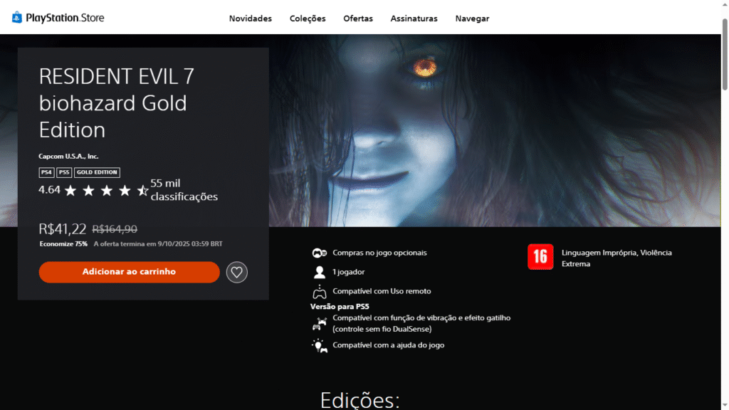 A PlayStation Store iniciou mais uma rodada de promoções que promete agitar os fãs de jogos de terror. Entre os destaques, está Resident Evil 7 Gold Edition, que recebeu um desconto imperdível de 75%.