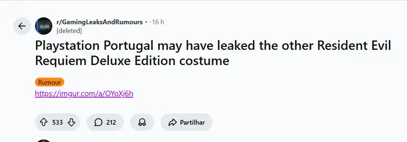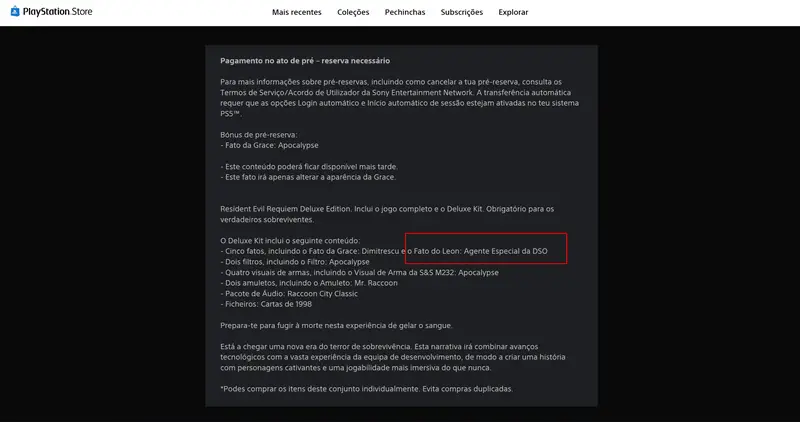 A internet entrou em ebulição na noite de quarta-feira (29), quando uma imagem supostamente retirada da PlayStation Store de Portugal indicava que Leon S. Kennedy estaria presente em Resident Evil Requiem. O print mostrava os bônus da edição Deluxe, incluindo uma roupa especial para Leon, o que fez os fãs acreditarem que o lendário agente voltaria no novo capítulo da franquia.
