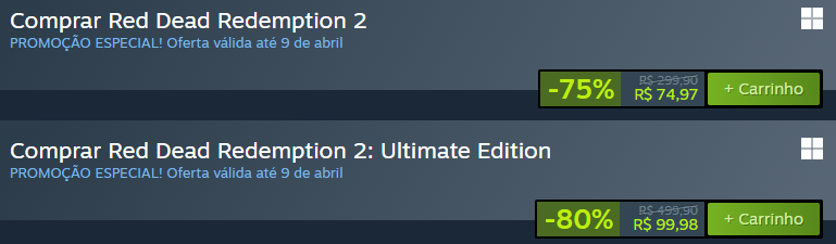 No entanto, o maior custo-benefício desta leva promocional reside na Ultimate Edition. Com um desconto ainda maior de 80%, esta versão pode ser adquirida por R$ 99,98. Além do jogo base, ela oferece conteúdos exclusivos para o Modo História — como missões de Assalto a Banco e Esconderijo de Gangue, um Puro-Sangue Inglês Alazão Preto e bônus de jogabilidade — além de trajes e armas bônus para o modo online.