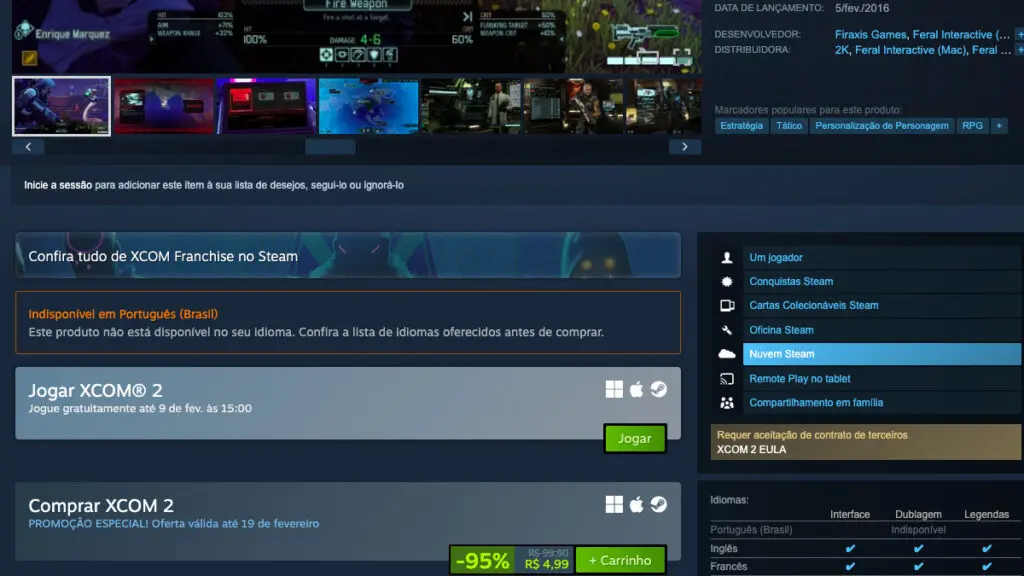 Para começar a jogar, basta acessar a página de XCOM 2 no Steam e clicar em “Jogar”. O download será iniciado e você terá acesso total ao conteúdo base do jogo até a próxima segunda-feira, 09 de fevereiro, às 15h.