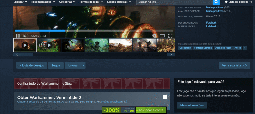 Mas atenção: a promoção termina no dia 24 de novembro, às 15h. Depois disso, o preço volta ao normal — então, corre pra Steam e garanta seu Warhammer: Vermintide 2 de graça enquanto dá tempo!